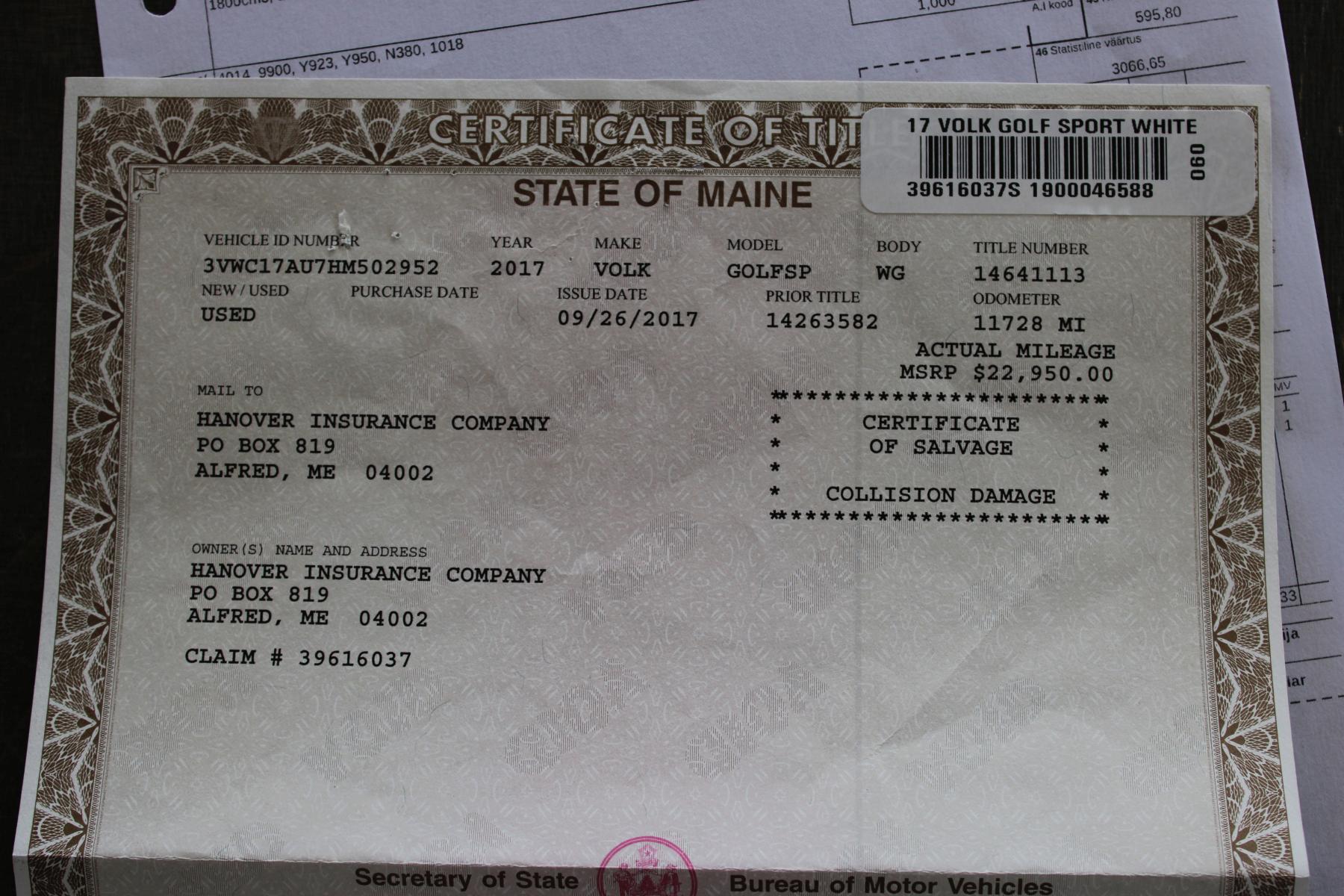 VOLKSWAGEN GOLF CHASSIS WITH US DOCUMENTS